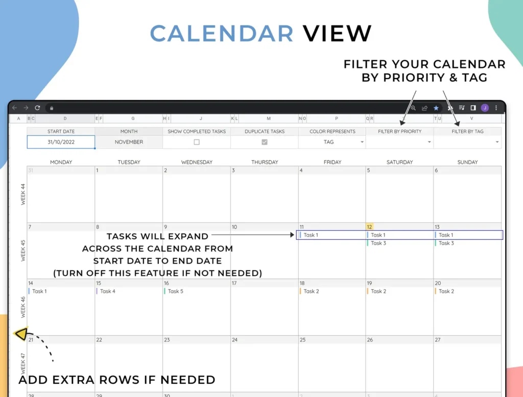 • 📆 Auto Task Expansion: Tasks automatically stretch across multiple days based on start and end dates