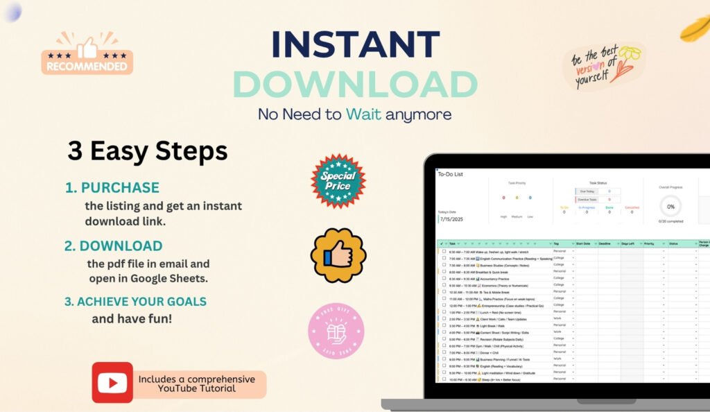 Take control of your daily routine with this beautifully designed Google Sheets To-Do List. Whether it’s work, school, personal goals, or household tasks — manage everything in one clean, powerful dashboard.